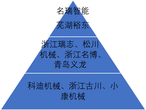 中国给袋式包装行业竞争格局中第一梯队企业给袋式包装机营收规模较大,在4亿元以上,与第二梯队拉开较大差距,第一梯队的代表企业有名瑞智能、芜湖裕东;第二梯队企业营收规模处于中等水平,在0.5至4亿元之间,具有一定产品及技术优势,代表企业有浙江瑞志、松川机械等;第三梯队企业的营收规模较小,在0.5亿一下,但仍具有一定的市场认可度,代表企业有科迪机械、浙江古川。