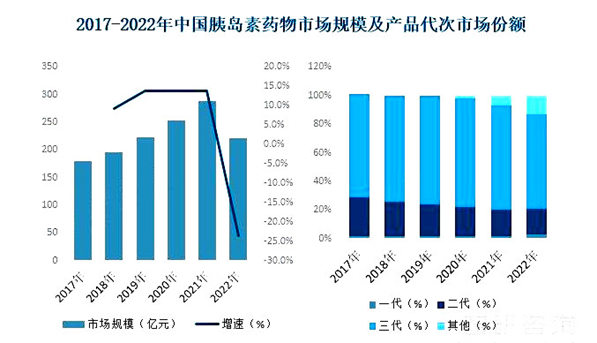 糖尿病属于慢性疾病,需要长期用药。近年来,国内糖尿病患病率呈逐渐攀升趋势,我国胰岛素市场增长速度也超过了全球平均增速,我国胰岛素市场已实现了高速增长,但参照发达国家的市场发展历程,国内市场仍有很大的发展潜力。根据市场调研数据,2022年受集采降价影响,我国胰岛素药物市场规模下跌至220.43亿元,其中三代胰岛素占比66%,份额下降7个百分点,三代胰岛素市场占比下滑主要系三代胰岛素集采整体降价幅度大于二代胰岛素所致。