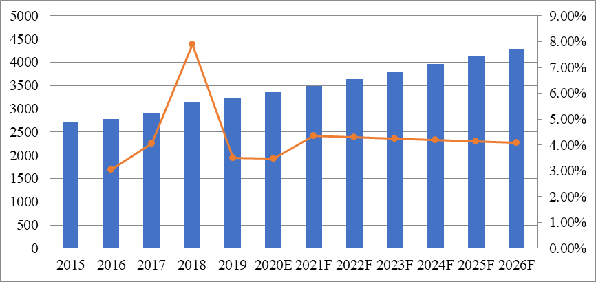 图:食品级润滑油销量(MT)和增长率(2015-2026年)